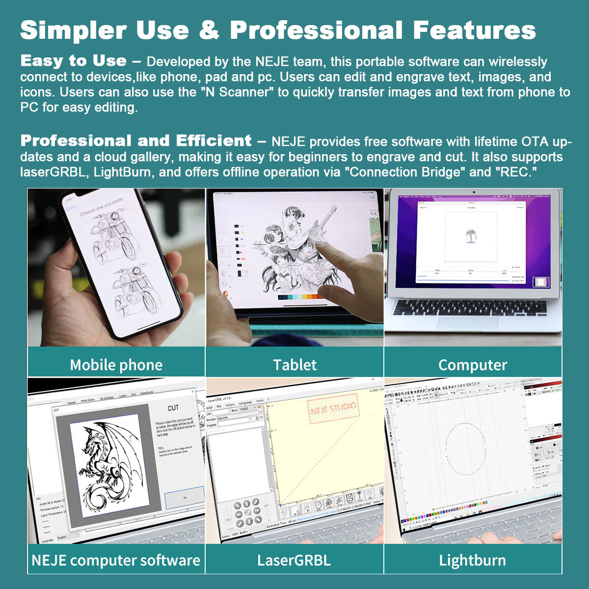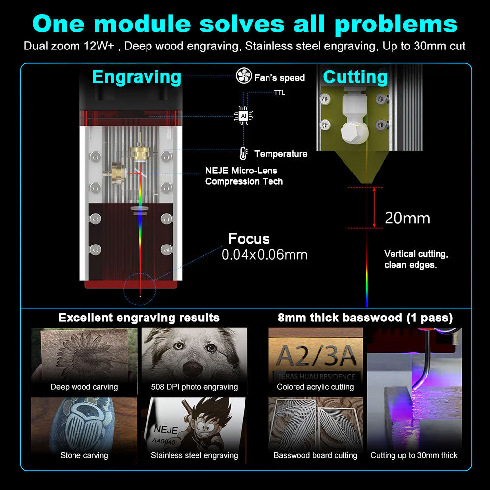 Featuring a flexible A3-sized working area to handle various shapes and materials for both engraving and cutting. Equipped with the classic NEJE A40640 module, it delivers high-quality stainless steel engraving and cuts materials up to 30mm thick. With three different focal lengths, it easily adapts to uneven surfaces for exquisite engraving results. Control via smartphone APP, supports standalone offline operation, and compatible with professional software—meeting both portability needs and intricate vector processing demands.