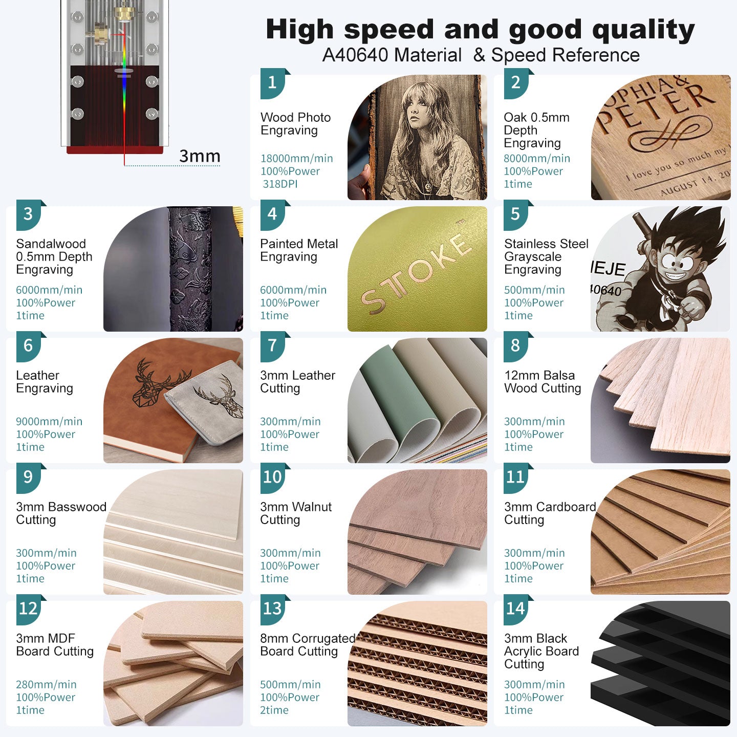 | Wood,Rubber, hardwood, bamboo, cardboard, painted metal, fabric, PU/PVC Leather, stainless steel, selected plastics, leather, PCB, aluminum oxide, electroplated layers, glass, ceramics, slate, etc. | Wood & plywood < 20 mm(30psi+ air), MDF < 6 mm;Leather < 3 mm, PU/PVC Leather < 3 mm;Corrugated cardboard < 8 mm, Hard cardboard 3 mm, Scratch paper Weeding invitation paper, Colored A4 paper, Kraft paper; Vinyl, Non-woven, ABS sheet < 2 mm - Dark, color PVC sheet 2 mm - Dark color; Cotton, Linen, Velvet, Canvas, Fabric polyester, Fabric synthetics; |