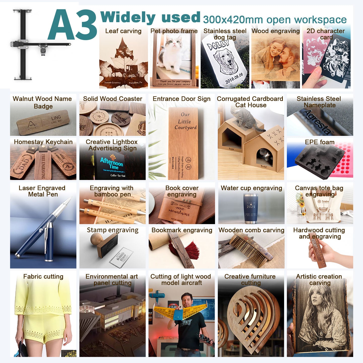 Spacious 300×420mm (A3) Workspace – Open-format design accommodates diverse materials; perfect for engraving photos, signs, pens, notebooks, tableware, and cutting models or creative projects.